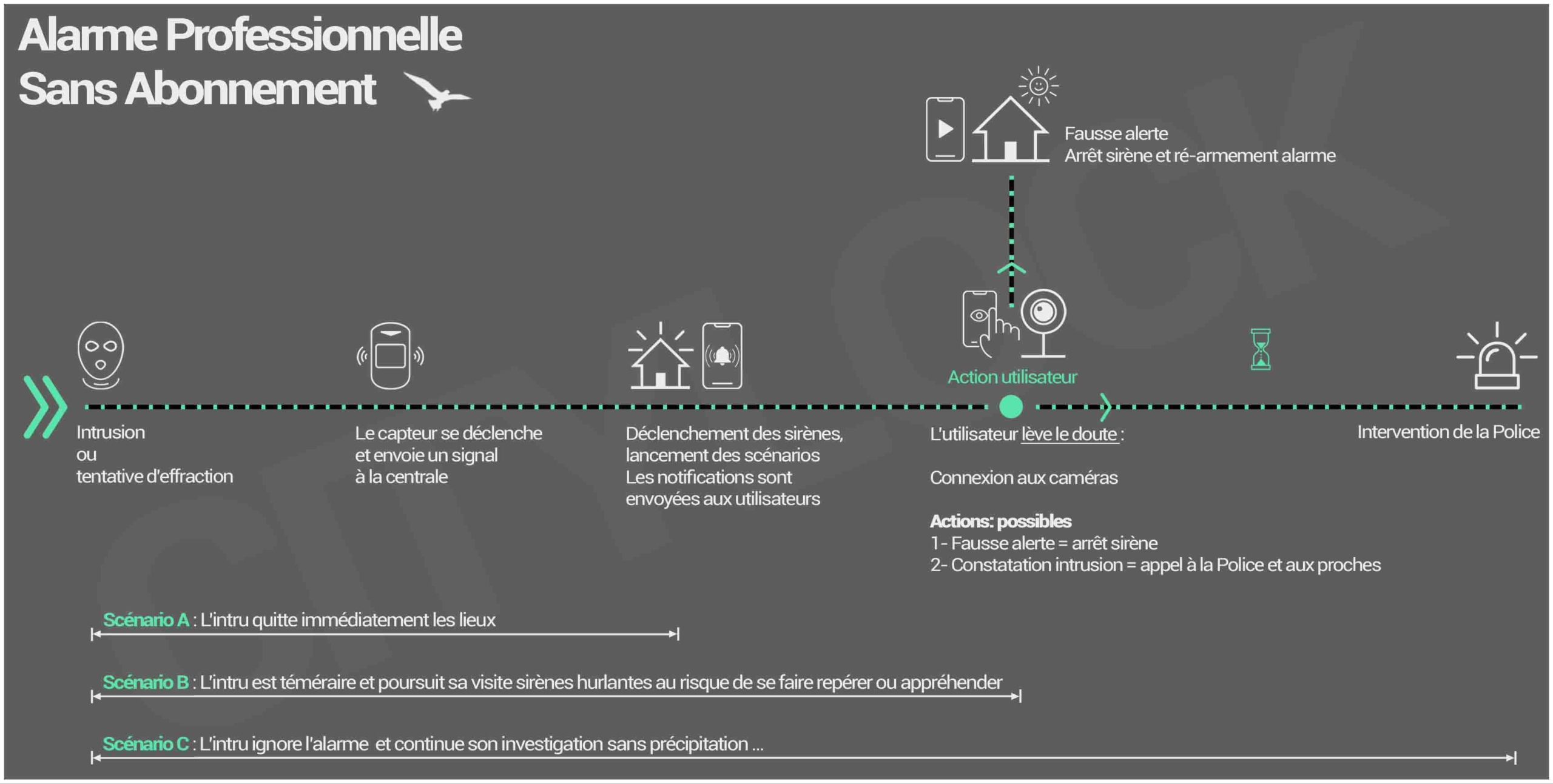 Généralement, en cas d’intrusion (ou tentative) l’intervention d’un agent de sécurité ne changera en rien la situation. L’effraction a été commise ou avortée et l’auteur a déjà quitté les lieux avant même que vous, ou l’opérateur CT, ne puissiez lever le doute.